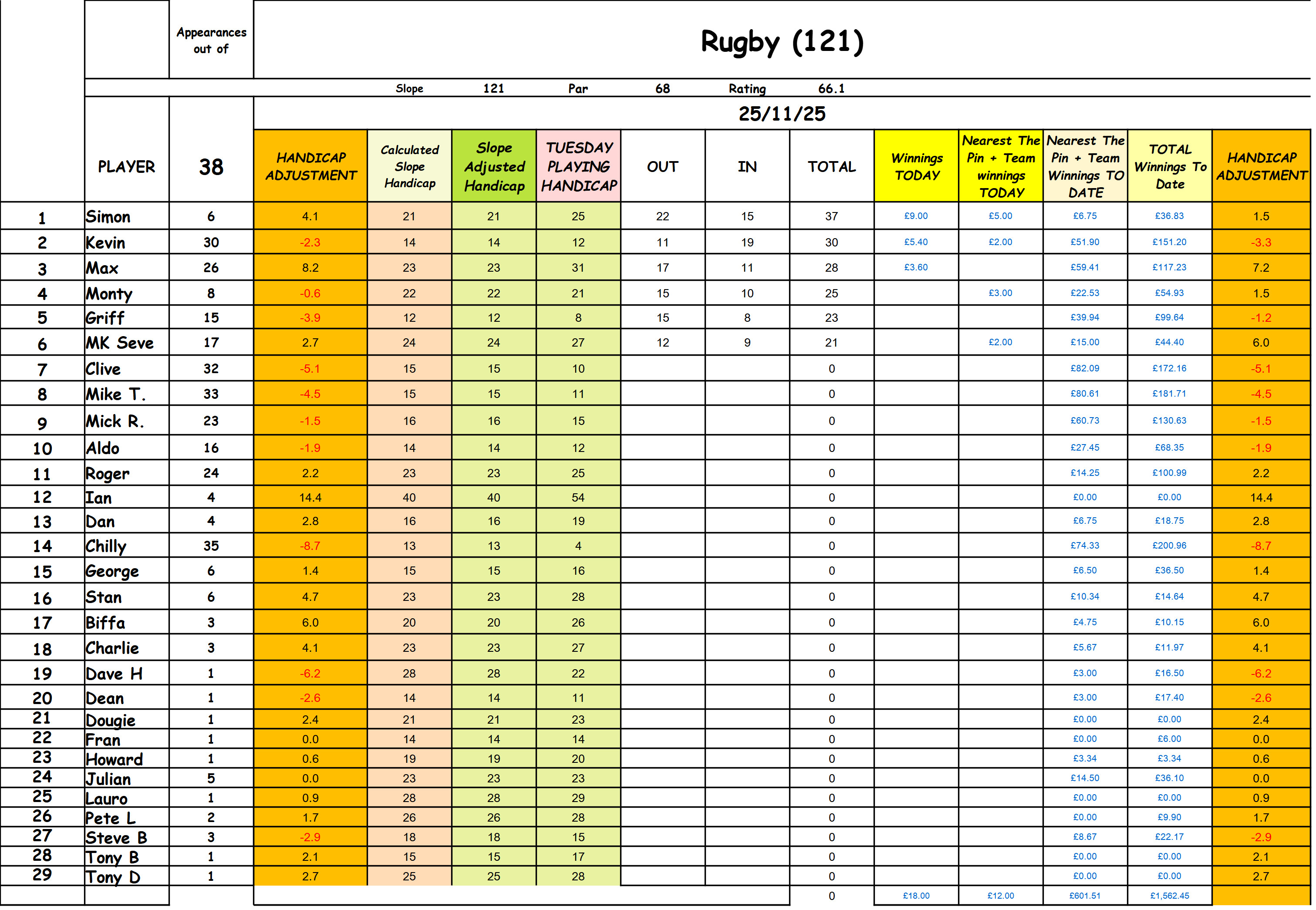 25-11-25 – Rugby (121) – Simply Simon ! Griff hangs on to the lead with a max of 5 rounds to go !!! (Min 10 appearances to qualify.)